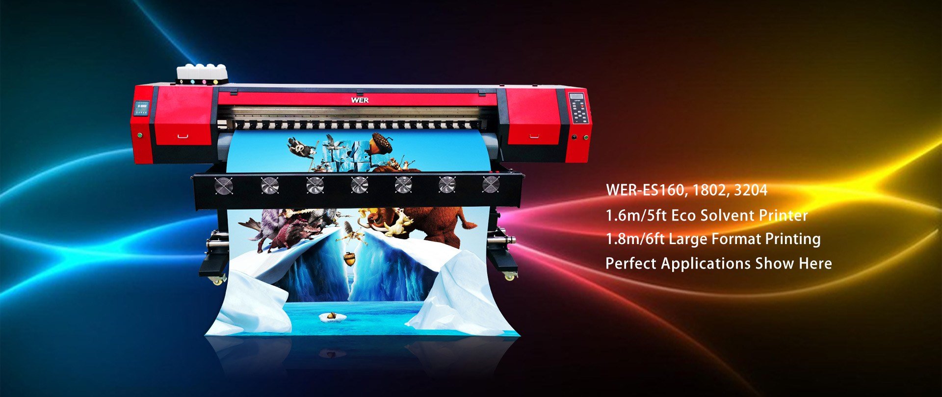 Pencetak pelarut Eco adalah terutamanya untuk mencetak bahan iklan dalaman dan luaran seperti sepanduk flex, kain spanduk, vinil, pelekat, filem backlit, vinil legap, kanvas ...